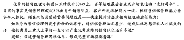 ·处于业绩突破新瓶颈,希望通过掌握营销管理全套技能,获得职业新发展或晋升的优秀营销人员; |