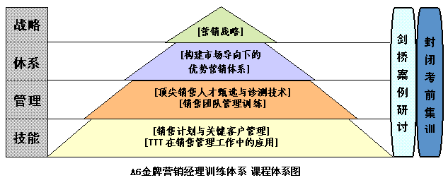 本训练营是新安人才网联合英国剑桥大学国际考试委员会针对企业营销管理人才推出的金牌训练课程项目。课程从市场营销管理人员必备的营销战略、营销体系、销售人才选拔、团队管理、销售计划与关键客户管理、销售培训等六项核心技能点入手,密合设计成营销管理四大体系(如下图),汇集数百万职业经理人成功经验,由具备丰富营销实战经验和理论高度的一线实战讲师、跨国公司营销高管构成经剑桥品质认证的专家梯队,通过深入浅出、风趣生动的案例式课程和情景式集训,让学员迅速掌握营销管理的核心理论和专业技能,指导学员学以致用的具体方法,在最短的时间内由学到练、学以致用,全面培养具备计划、组织、领导、控制四种能力的优秀市场营销管理人才。